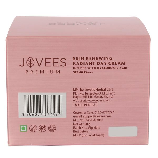 জোভিস স্কিন রিনিউয়িং রেডিয়েন্ট ডে ক্রিম DPF-40PA+++ এর সাথে হায়লুরোনিক অ্যাসিড মিশ্রিত করা হয়, যা আমাদের শরীরে একটি প্রাকৃতিকভাবে উৎপন্ন উপাদান যা ত্বকের কোষে আর্দ্রতাকে আকর্ষন করে এবং ধরে রাখে যা ত্বকের আরও হাইড্রেটেড এবং মোটা অনুভব করতে দেয়। প্রদিনের ব্যবহার করা এই ক্রিম ত্বকের প্রাকৃতিক প্রতিরক্ষাকে উন্নত করবে য এটিকে সুক্ষ্ম রেখা এবং বলিরো, পিগমেন্টেশন, পরিবেশগত বয়স-কারক এবং দুষণকারীর বিরুদ্ধে লড়াই করতে সাহায্য করবে।