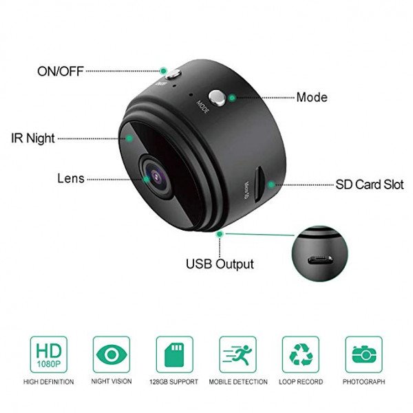 • High Definition Support: 1080P (Full-HD)Sensor Technology: CMOSType: MiniPackage: YesModel Number: A9 mini CameraBuilt-in Memory Size: NonMemory Card Type: MicroSD / TFType: MiniModel Number: A9 spiedWifi IP mini camera: Wifi IP mini cameraVideo Resolution: 1920*1080PVideo Format: ASFCompressed Format: H.264APP Support: Android/iOSPlayer Software: VLCPlayer/SMPlayerVLCPlayer/SMPlayer: Built-in rechargeable lithium batteryFeature 1: Huawei HiSilicon chipFeature  2: Motion detection.