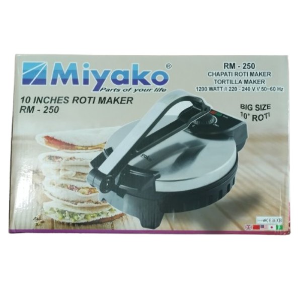 The Miyako RM-250 Electric Roti Maker is designed to make roti preparation easy and efficient. Size: 10-inch diameter, with dimensions of 28 x 20 x 19 cm, Weight: 1.61 kg, Power: 875 Watts, with an input voltage of AC 220-240V, 50 Hz, Material: Stainless steel cover with Bakelite handles and knob for safe handling, Surface: Non-stick coating (PTFE) to prevent sticking and ensure easy cleaning, Features:Auto switch-off feature for safety, Thermostatic control to maintain the right temperature, Power ON red light indicator, Copper wiring for durability, 3-pin molded power cord (1.3 m long). This roti maker is ideal for single working people and students, making the process of preparing rotis hassle-free and efficient.